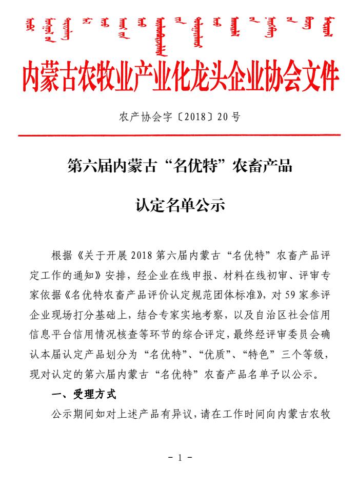 標題:第六屆內(nèi)蒙古“名優(yōu)特”農(nóng)畜產(chǎn)品認定名單公示