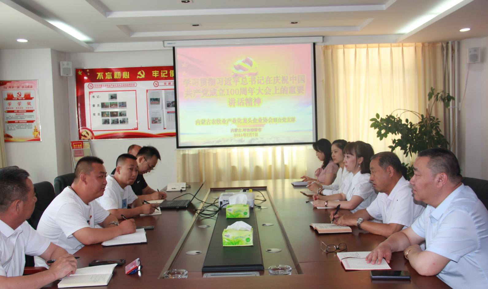 2021年7月7日上午,內(nèi)蒙古農(nóng)牧業(yè)產(chǎn)業(yè)化龍頭企業(yè)協(xié)會(huì)聯(lián)合黨支部書記李陽(yáng)主持召開“學(xué)習(xí)貫徹習(xí)近平總書記在慶祝中國(guó)共產(chǎn)黨成立100周年大會(huì)上的重要講話精神”座談會(huì)。協(xié)會(huì)會(huì)長(zhǎng)周勇,執(zhí)行會(huì)長(zhǎng)林永亮,執(zhí)行秘書長(zhǎng)呼群等所有在呼黨員干部參加會(huì)議。
