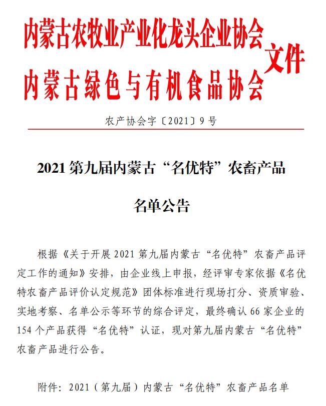 標(biāo)題:2021第九屆內(nèi)蒙古“名優(yōu)特”農(nóng)畜產(chǎn)品名單公告