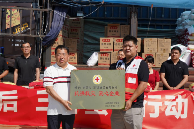 風(fēng)雨突襲巴彥淖爾時(shí),內(nèi)蒙古農(nóng)牧業(yè)產(chǎn)業(yè)化龍頭企業(yè)協(xié)會(huì)會(huì)長(zhǎng)單位巴彥淖爾市三胖蛋食品有限公司與家鄉(xiāng)共赴暖陽(yáng),8月1日,三胖蛋公司開(kāi)展“一戶(hù)不落”精準(zhǔn)捐贈(zèng)活動(dòng),為套海鎮(zhèn)和平村436戶(hù)受災(zāi)村民送去價(jià)值15萬(wàn)元的米、面、油等生活物資。這個(gè)從河套平原走向全國(guó)的品牌,用行動(dòng)詮釋著”家鄉(xiāng)人永遠(yuǎn)和家鄉(xiāng)人站在一起“的質(zhì)樸承諾。