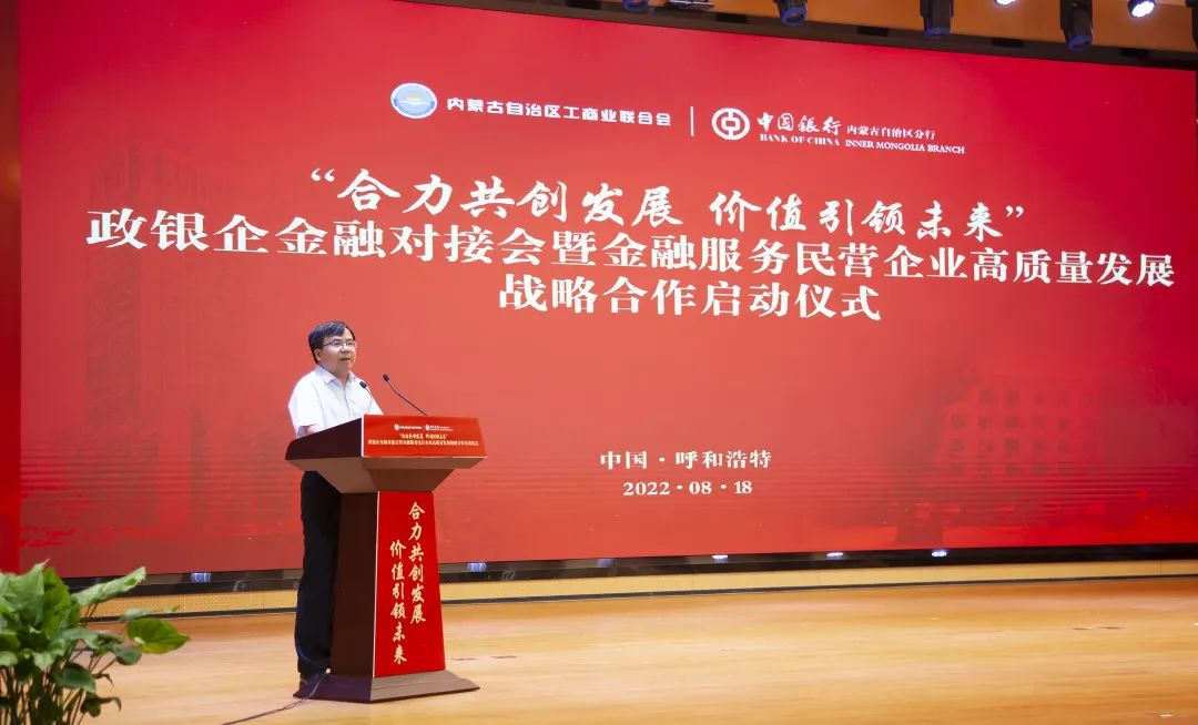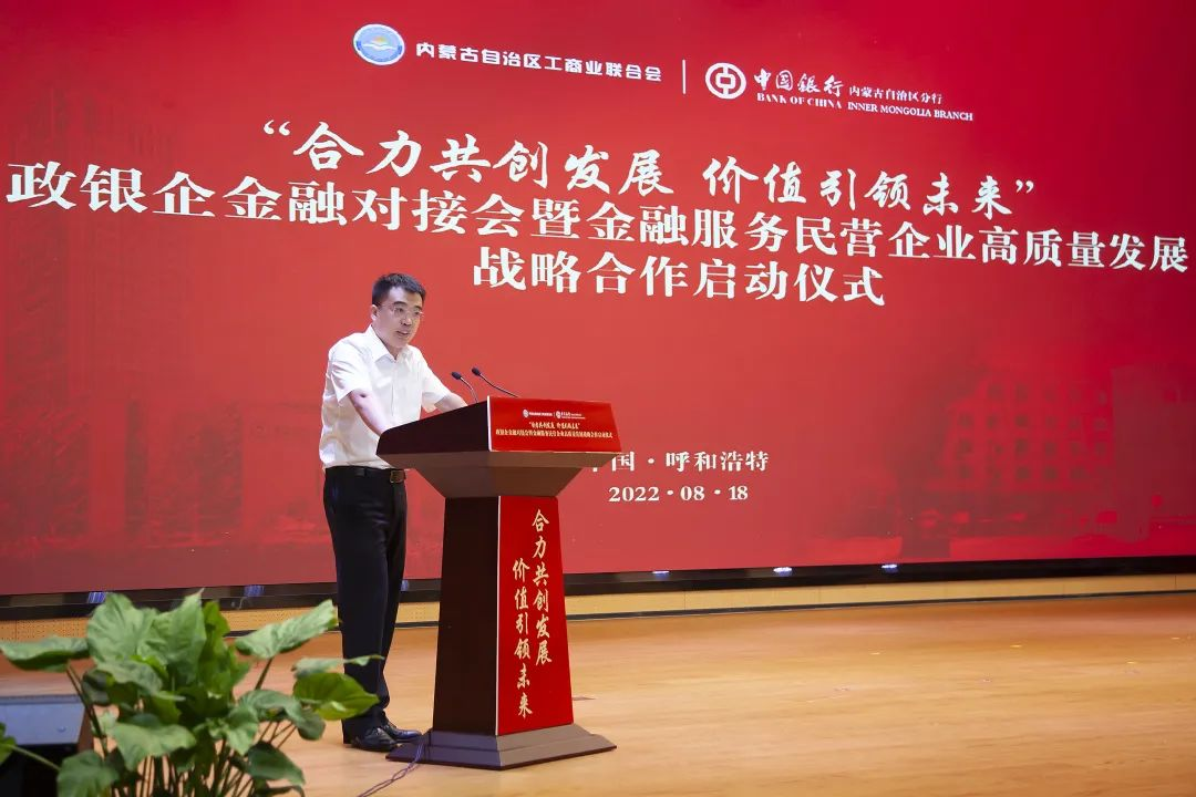 胡文勇行長在開場致辭中表示,一直以來,自治區(qū)工商聯(lián)充分發(fā)揮統(tǒng)戰(zhàn)性、經(jīng)濟性、民間性綜合優(yōu)勢,團結和帶領廣大非公有制經(jīng)濟人士,與時俱進,大膽創(chuàng)新,努力實踐,推動優(yōu)化營商環(huán)境,促進我區(qū)非公有制經(jīng)濟又好又快發(fā)展,為全面建設小康社會、構建和諧社會作出重要貢獻。作為唯一一家持續(xù)經(jīng)營超過百年的國有大行,中國銀行秉承“融通世界、造福社會”的崇高使命,將自身發(fā)展與地方經(jīng)濟發(fā)展緊密相連,主動擔當服務支持民營企業(yè)發(fā)展壯大的金融重任。未來,中國銀行內(nèi)蒙古區(qū)分行將繼續(xù)深耕細作民營經(jīng)濟領域的融資服務,在普惠金融、科技金融、綠色金融等領域加強金融支持,緩解小微企業(yè)“融資難、融資貴”問題,助企紓困,風雨同舟,為深化政銀企合作共贏發(fā)展貢獻新力量!