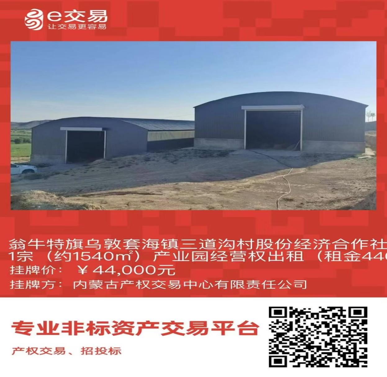 翁牛特旗烏敦套海鎮(zhèn)三道溝村股份經(jīng)濟合作社1宗(約1540㎡)產(chǎn)業(yè)園經(jīng)營權出租(租金44000元/年,租期5年)