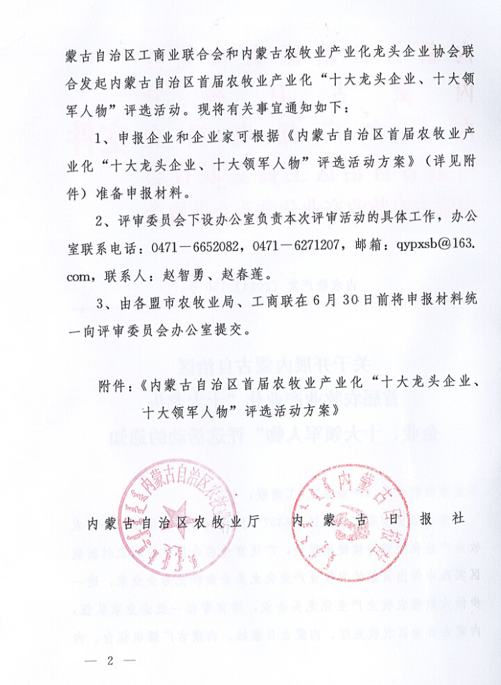 附件: 內蒙古自治區(qū)首屆農牧業(yè)產業(yè)化“十大龍頭企業(yè)、十大領軍人物”評選活動方案.doc