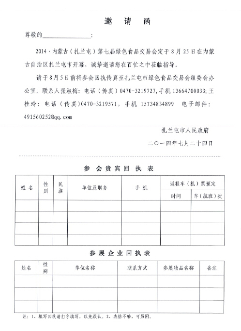 2014·內(nèi)蒙古(扎蘭屯)第七屆綠色食品交易會(huì)邀請(qǐng)函