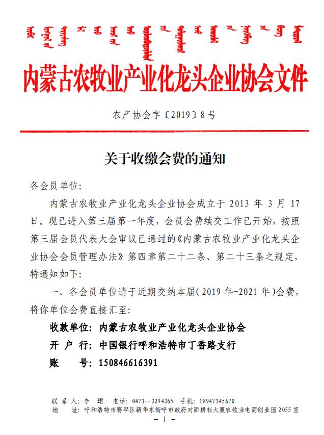 農(nóng)產(chǎn)協(xié)會字[2019]8號 關(guān)于收繳會費(fèi)的通知