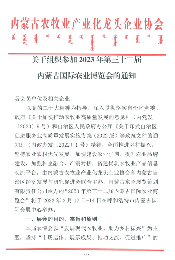 關(guān)于組織參加2023年第三十二屆內(nèi)蒙古國際農(nóng)業(yè)博覽會(huì)的通知