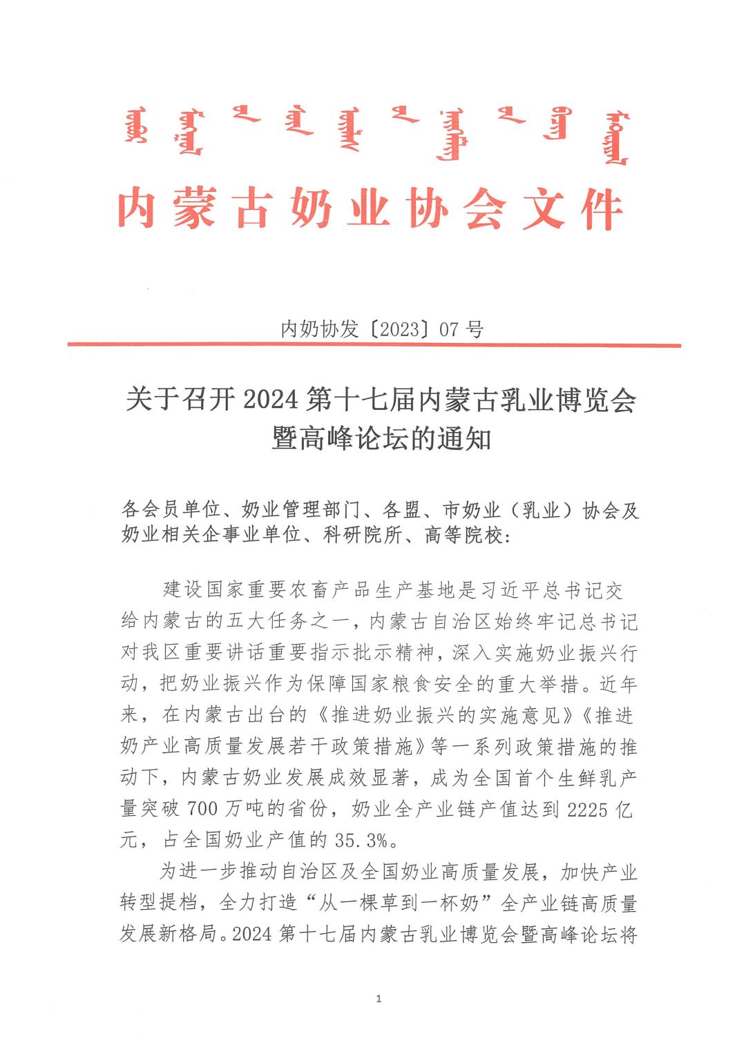 轉(zhuǎn)發(fā):關(guān)于召開2024第十七屆內(nèi)蒙古乳業(yè)博覽會(huì)暨高峰論壇的通知